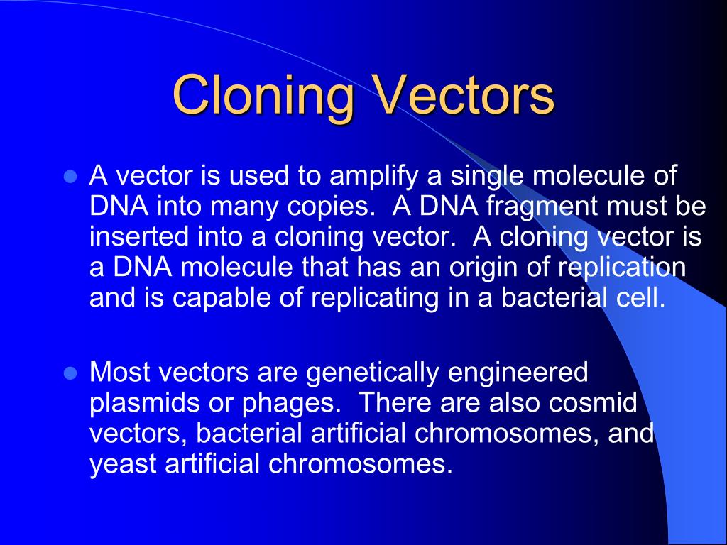 Cloning Vectors • A vector is used to amplify a single molecule of DNA into many copies. A DNA fragment must be inserted into a cloning vector. A cloning vector is a DNA molecule that has an origin of replication and is capable of replicating in a bacterial cell. • Most vectors are genetically engineered plasmids or phages. There are also cosmid vectors, bacterial artificial chromosomes, and yeast artificial chromosomes.