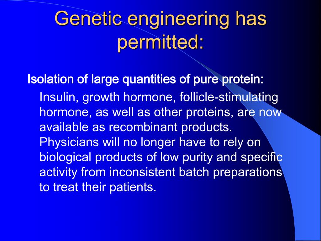 Genetic engineering has permitted: Isolation of large quantities of pure protein: Insulin, growth hormone, follicle-stimulating hormone, as well as other proteins, are now available as recombinant products. Physicians will no longer have to rely on biological products of low purity and specific activity from inconsistent batch preparations to treat their patients.