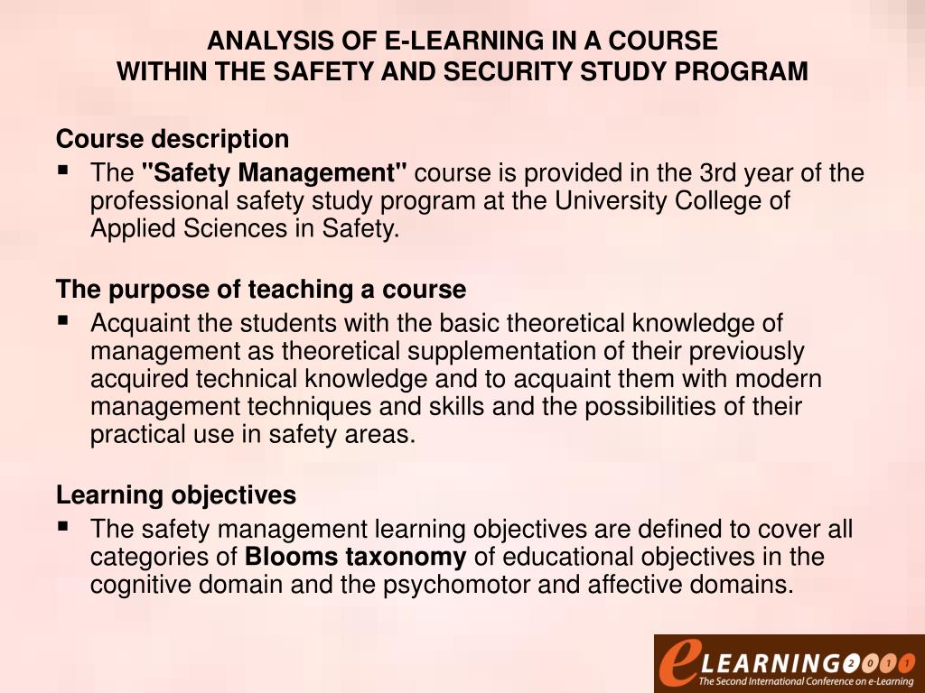 ANALYSIS OF E-LEARNING INA COURSE WITHIN THE SAFETY AND SECURITY STUDY PROGRAM Course description • The "Safety Management" course is provided in the 3rd year of the professional safety study program at the University College of Applied Sciences in Safety. The purpose of teaching a course • Acquaint the students with the basic theoretical knowledge of management as theoretical supplementation of their previously acquired technical knowledge and to acquaint them with modern management techniques and skills and the possibilities of their practical use in safety areas. Learning objectives • The safety management learning objectivesare defined to cover all categories of Blooms taxonomy of educational objectives in the cognitive domain and the psychomotor and affective domains.