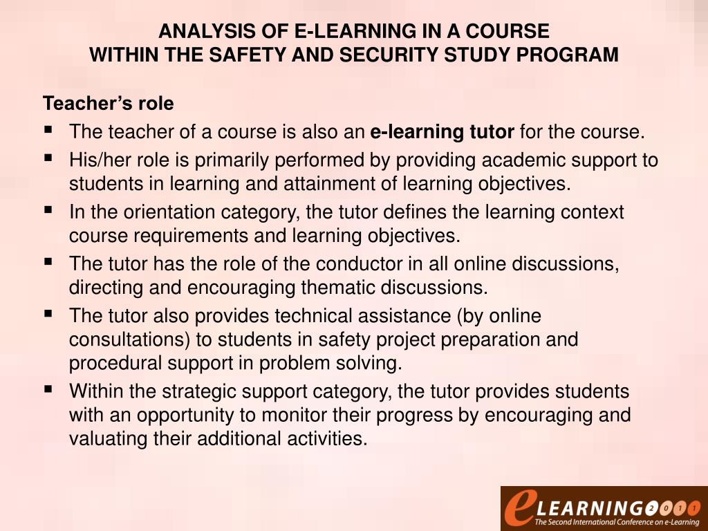 ANALYSIS OF E-LEARNING INA COURSE WITHIN THE SAFETY AND SECURITY STUDY PROGRAM Teacher’s role • The teacher of a course is also an e-learning tutor for the course. • His/her role is primarily performed by providing academic support to students in learning and attainment of learning objectives. • In the orientation category, the tutor defines the learning context course requirements and learning objectives. • The tutor has the role of the conductor in all online discussions, directing and encouraging thematic discussions. • The tutor also provides technical assistance (by online consultations) to students in safety project preparation and procedural support in problem solving. • Within the strategic support category, the tutor provides students with an opportunity to monitor their progress by encouraging and valuating their additional activities.