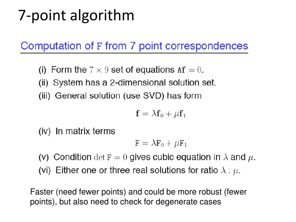7-point algorithm Faster (need fewer points) and could be more robust (fewer points), but also need to check for degenerate cases