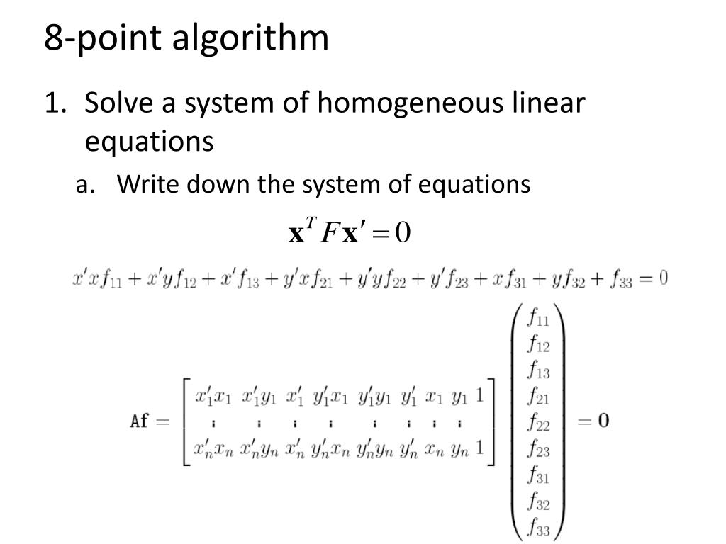 8-point algorithm • Solve a system of homogeneous linear equations • Write down the system of equations
