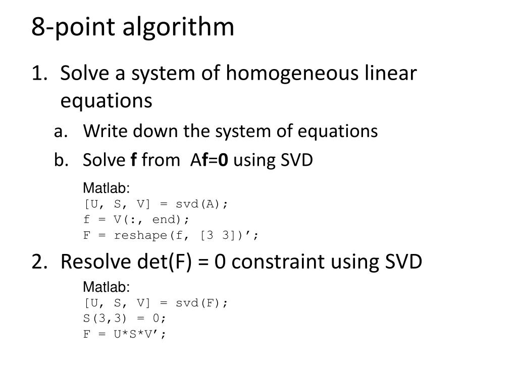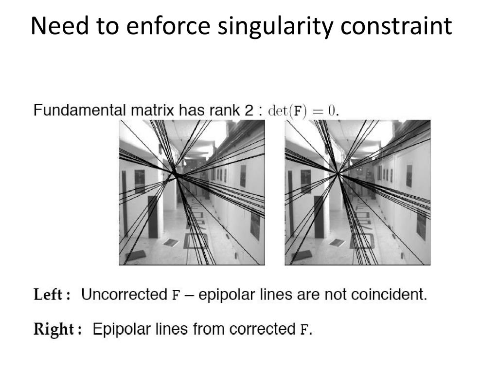 8-point algorithm • Solve a system of homogeneous linear equations • Write down the system of equations • Solve f from Af=0 using SVD • Resolve det(F) = 0 constraint using SVD Matlab: [U, S, V] = svd(A); f = V(:, end); F = reshape(f, [3 3])’; Matlab: [U, S, V] = svd(F); S(3,3) = 0; F = U*S*V’;