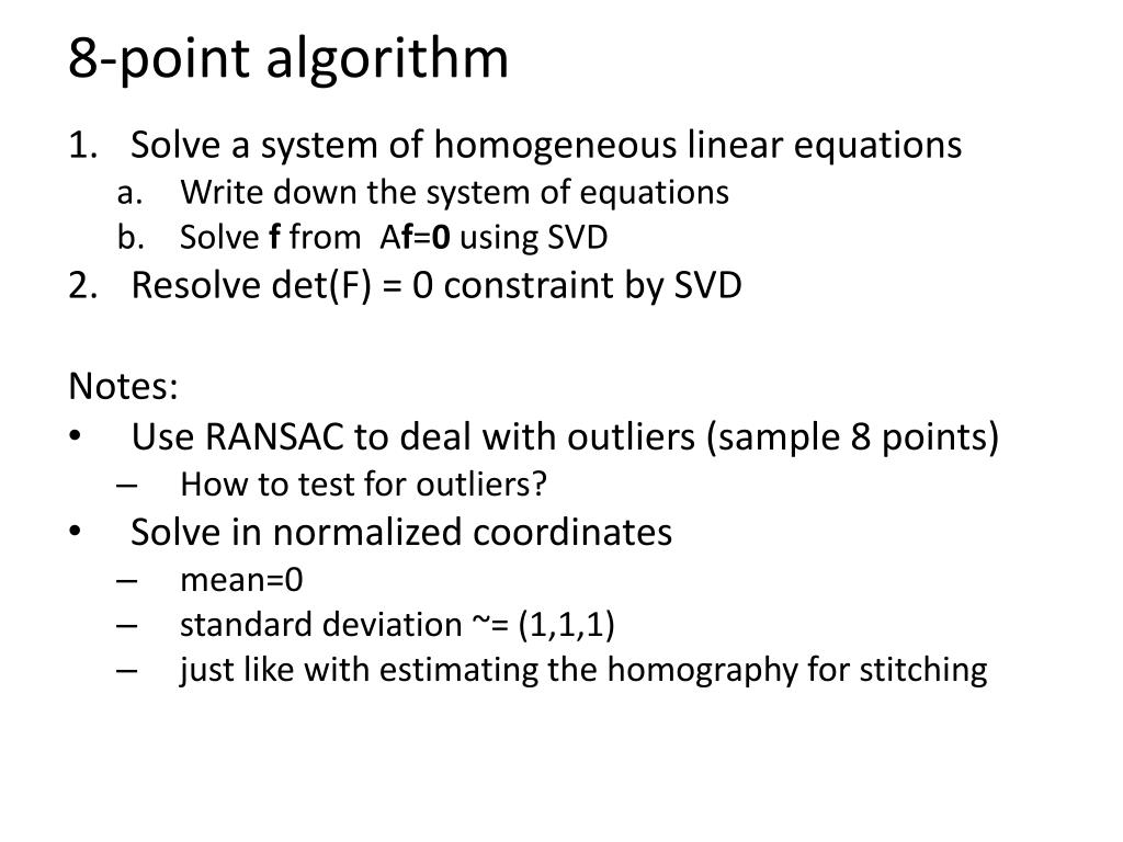 8-point algorithm • Solve a system of homogeneous linear equations • Write down the system of equations • Solve f from Af=0 using SVD • Resolve det(F) = 0 constraint by SVD Notes: • Use RANSAC to deal with outliers (sample 8 points) • How to test for outliers? • Solve in normalized coordinates • mean=0 • standard deviation ~= (1,1,1) • just like with estimating the homography for stitching