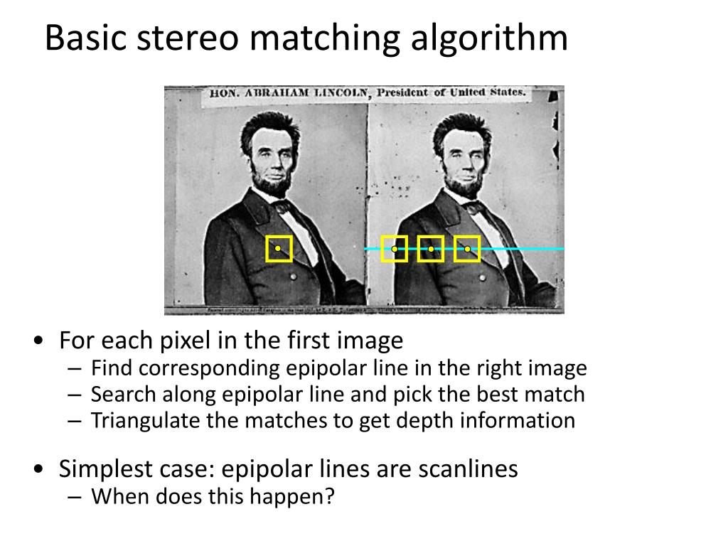 Basic stereo matching algorithm • For each pixel in the first image • Find corresponding epipolar line in the right image • Search along epipolar line and pick the best match • Triangulate the matches to get depth information • Simplest case: epipolar lines are scanlines • When does this happen?
