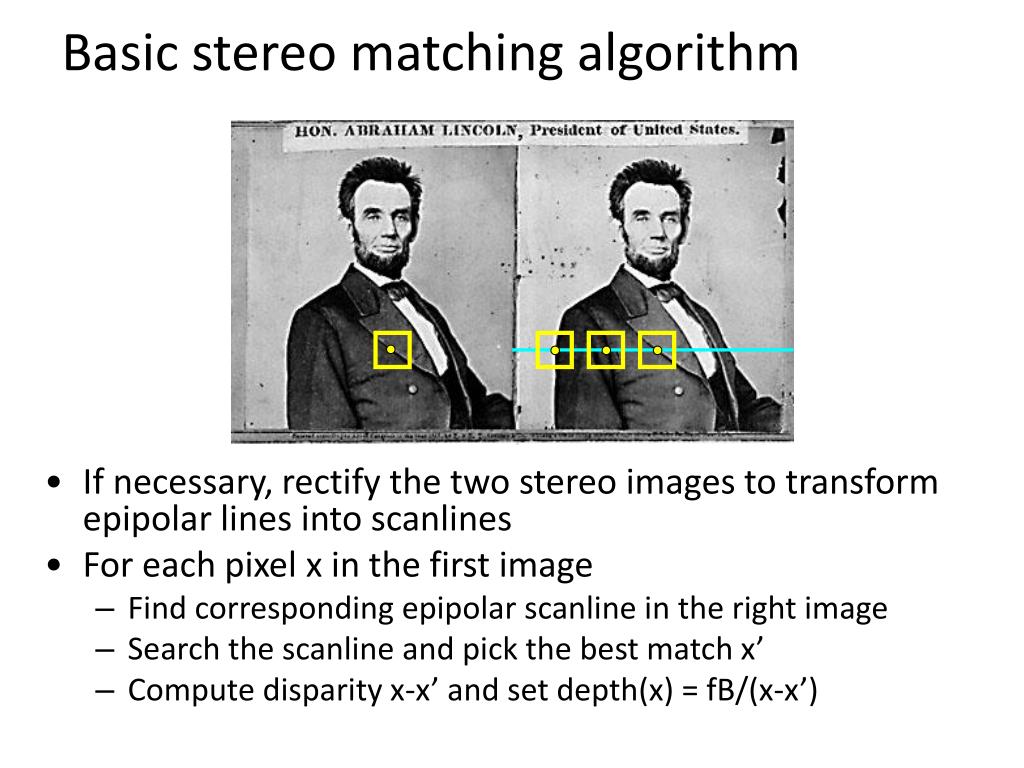 Basic stereo matching algorithm • If necessary, rectify the two stereo images to transform epipolar lines into scanlines • For each pixel x in the first image • Find corresponding epipolarscanline in the right image • Search the scanline and pick the best match x’ • Compute disparity x-x’ and set depth(x) = fB/(x-x’)