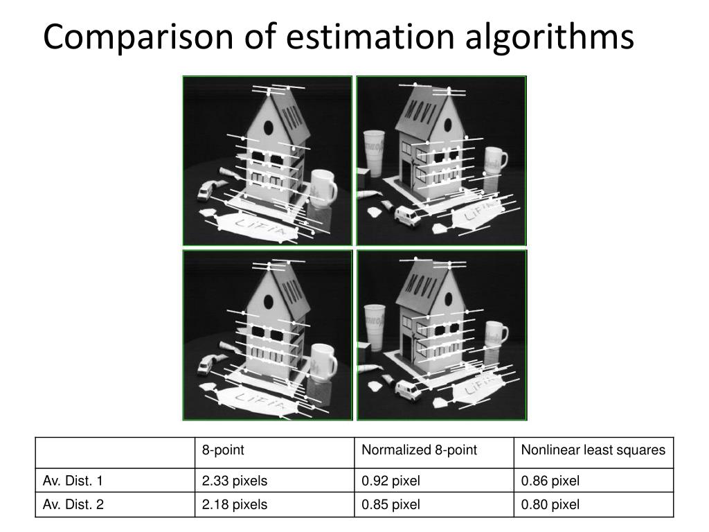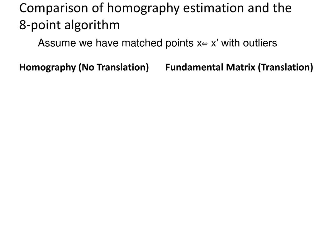 Comparison of homography estimation and the 8-point algorithm Assume we have matched points x x’ with outliers Homography (No Translation) Fundamental Matrix (Translation)