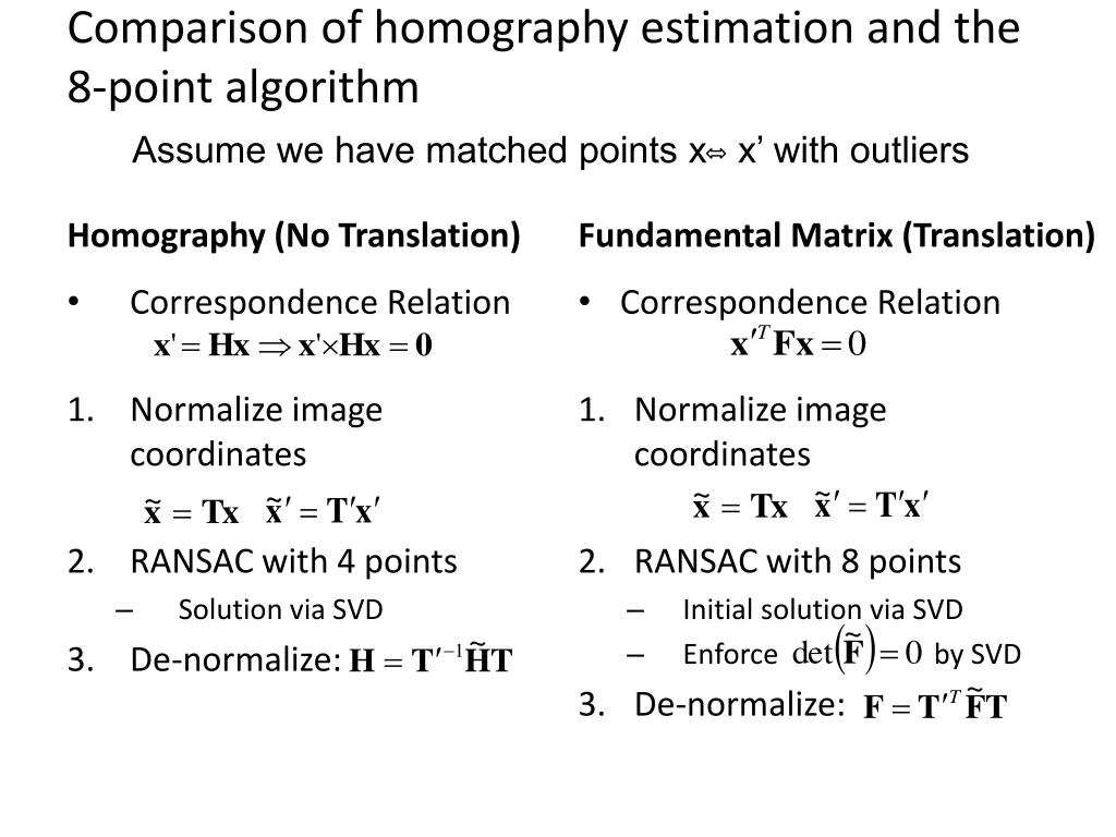 Comparison of homography estimation and the 8-point algorithm Assume we have matched points x x’ with outliers Homography (No Translation) Fundamental Matrix (Translation) Correspondence Relation Normalize image coordinates RANSAC with 8 points Initial solution via SVD Enforce by SVD De-normalize: • Correspondence Relation • Normalize image coordinates • RANSAC with 4 points • Solution via SVD • De-normalize: