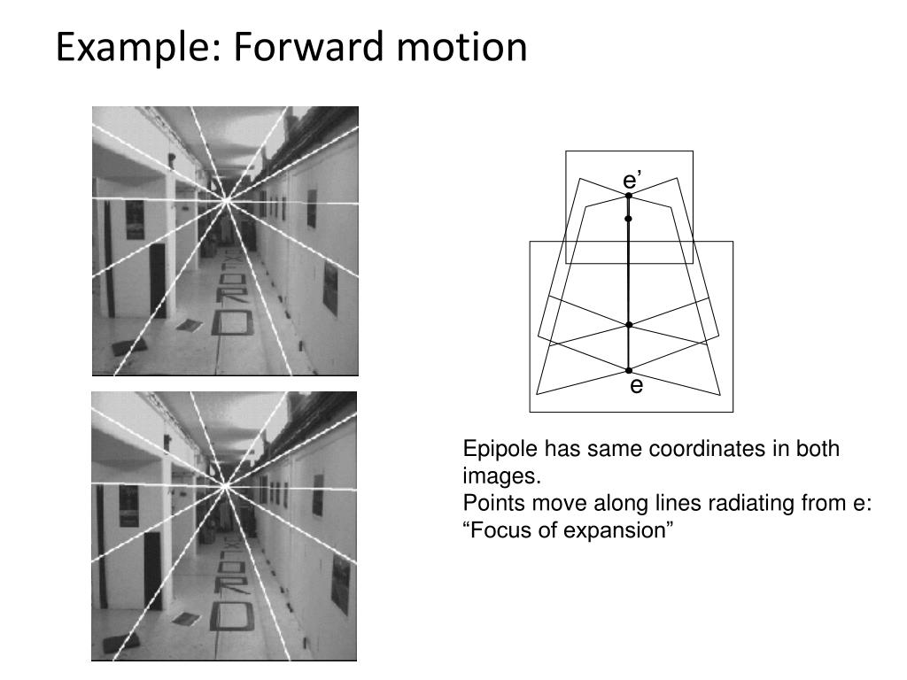 Example: Forward motion e’ e Epipole has same coordinates in both images. Points move along lines radiating from e: “Focus of expansion”