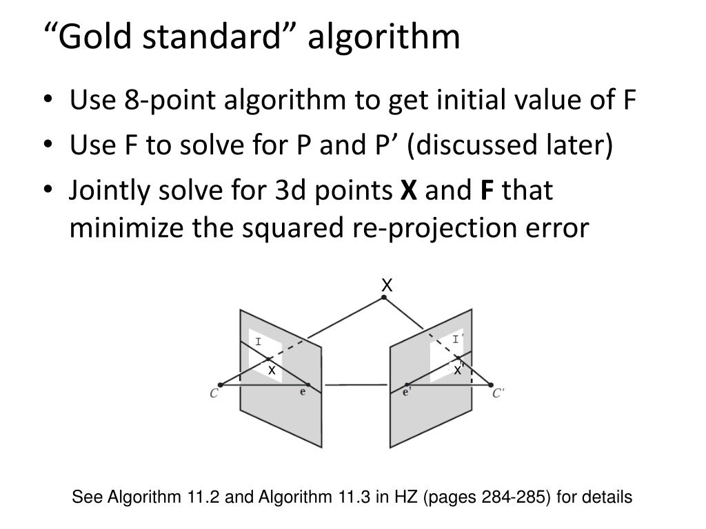 “Gold standard” algorithm X • Use 8-point algorithm to get initial value of F • Use F to solve for P and P’ (discussed later) • Jointly solve for 3d points X and F that minimize the squared re-projection error x x' See Algorithm 11.2 and Algorithm 11.3 in HZ (pages 284-285) for details