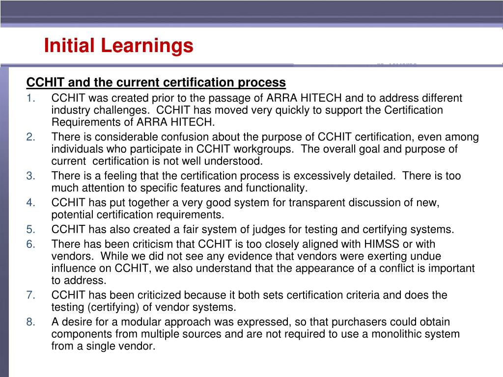 Initial Learnings CCHIT and the current certification process CCHIT was created prior to the passage of ARRA HITECH and to address different industry challenges. CCHIT has moved very quickly to support the Certification Requirements of ARRA HITECH. There is considerable confusion about the purpose of CCHIT certification, even among individuals who participate in CCHIT workgroups. The overall goal and purpose of current certification is not well understood. There is a feeling that the certification process is excessively detailed. There is too much attention to specific features and functionality. CCHIT has put together a very good system for transparent discussion of new, potential certification requirements. CCHIT has also created a fair system of judges for testing and certifying systems. There has been criticism that CCHIT is too closely aligned with HIMSS or with vendors. While we did not see any evidence that vendors were exerting undue influence on CCHIT, we also understand that the appearance of a conflict is important to address. CCHIT has been criticized because it both sets certification criteria and does the testing (certifying) of vendor systems. A desire for a modular approach was expressed, so that purchasers could obtain components from multiple sources and are not required to use a monolithic system from a single vendor.