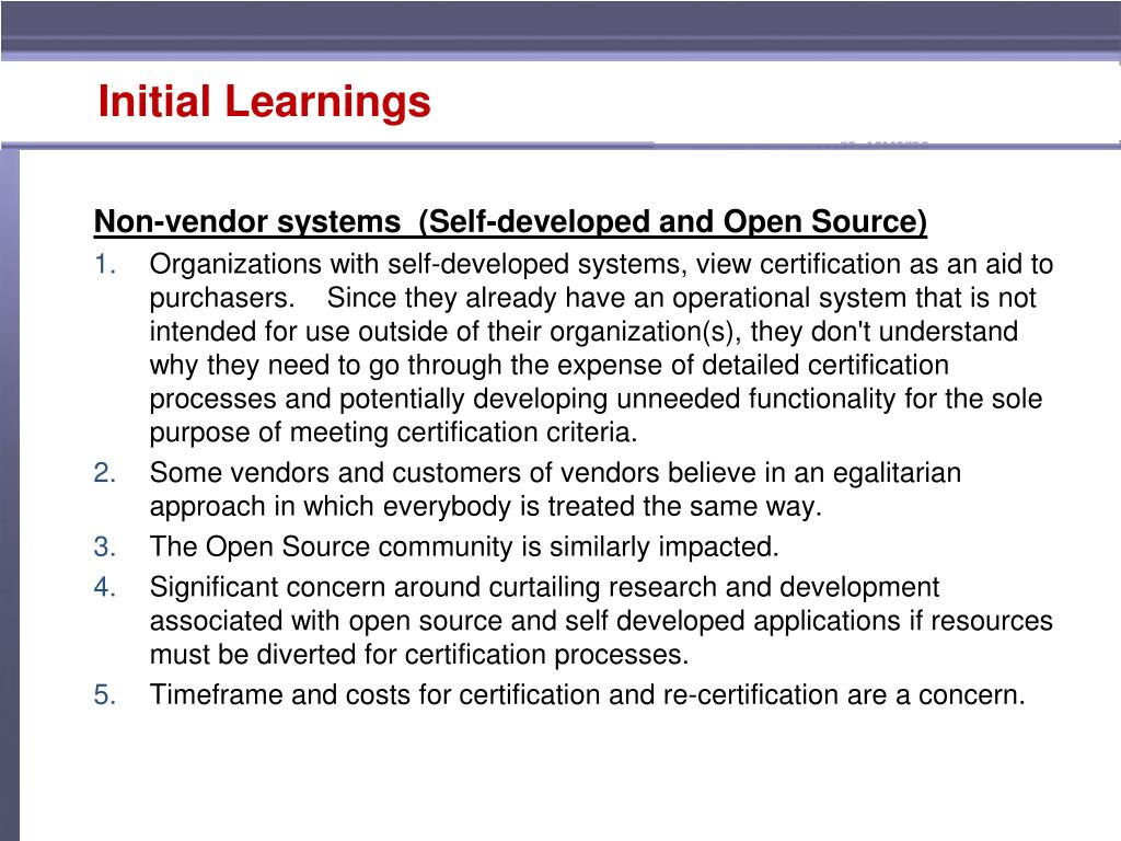 Initial Learnings Non-vendor systems (Self-developed and Open Source) Organizations with self-developed systems, view certification as an aid to purchasers. Since they already have an operational system that is not intended for use outside of their organization(s), they don't understand why they need to go through the expense of detailed certification processes and potentially developing unneeded functionality for the sole purpose of meeting certification criteria. Some vendors and customers of vendors believe in an egalitarian approach in which everybody is treated the same way. The Open Source community is similarly impacted. Significant concern around curtailing research and development associated with open source and self developed applications if resources must be diverted for certification processes. Timeframe and costs for certification and re-certification are a concern.