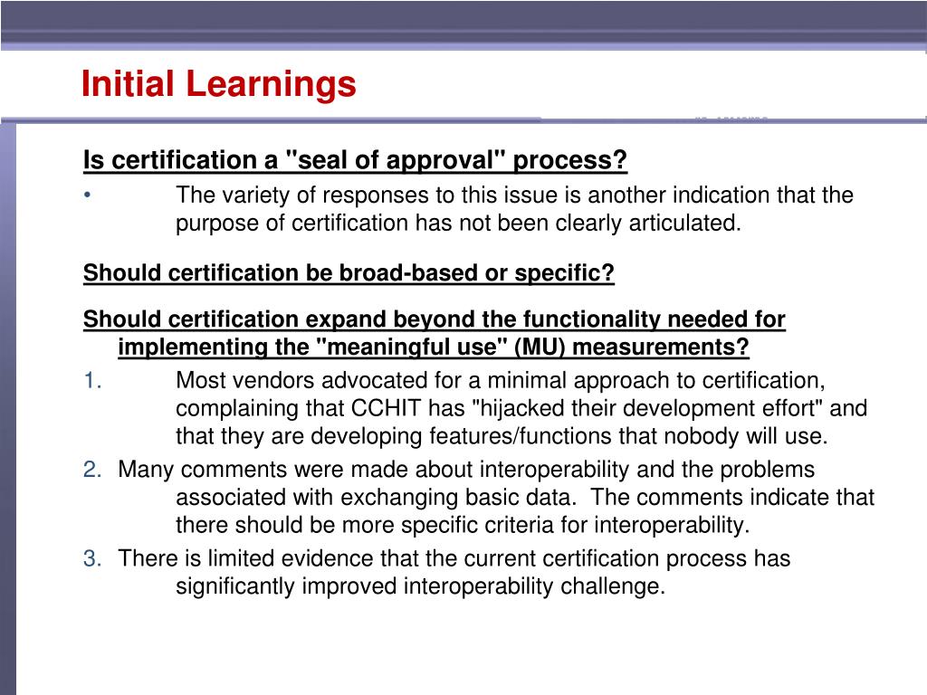 Initial Learnings Is certification a "seal of approval" process? The variety of responses to this issue is another indication that the purpose of certification has not been clearly articulated. Should certification be broad-based or specific? Should certification expand beyond the functionality needed for implementing the "meaningful use" (MU) measurements? Most vendors advocated for a minimal approach to certification, complaining that CCHIT has "hijacked their development effort" and that they are developing features/functions that nobody will use. Many comments were made about interoperability and the problems associated with exchanging basic data. The comments indicate that there should be more specific criteria for interoperability. There is limited evidence that the current certification process has significantly improved interoperability challenge.