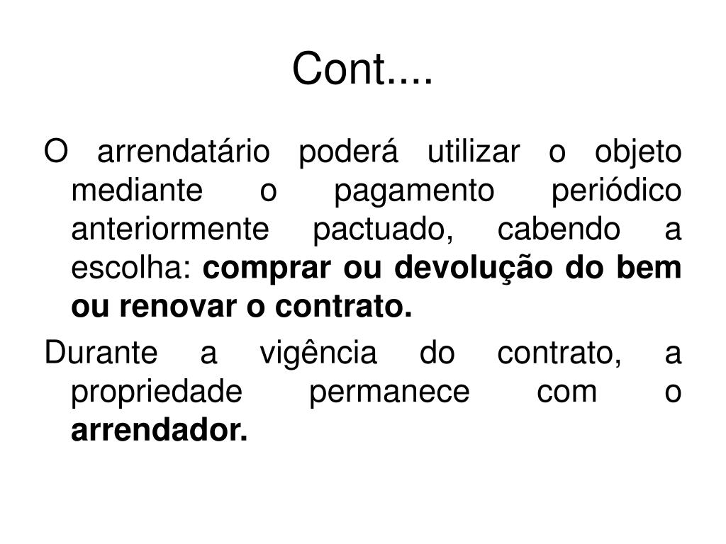 Cont.... O arrendatário poderá utilizar o objeto mediante o pagamento periódico anteriormente pactuado, cabendo a escolha: comprar ou devolução do bem ou renovar o contrato. Durante a vigência do contrato, a propriedade permanece com o arrendador.