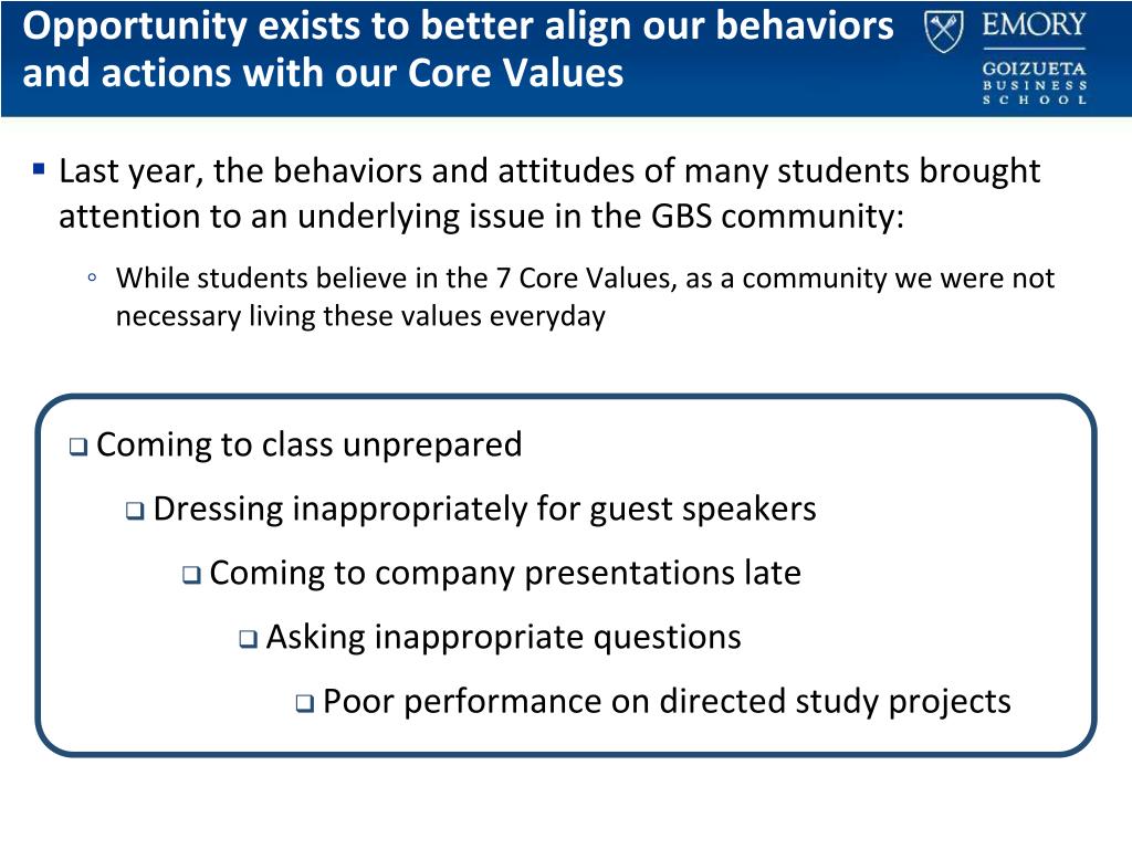 Goizueta MBA Student Brand Statement. Opportunity exists to better align our behaviors and actions with our Core Values. Last year, the behaviors and attitudes of many students brought attention to an underlying issue in the GBS community: