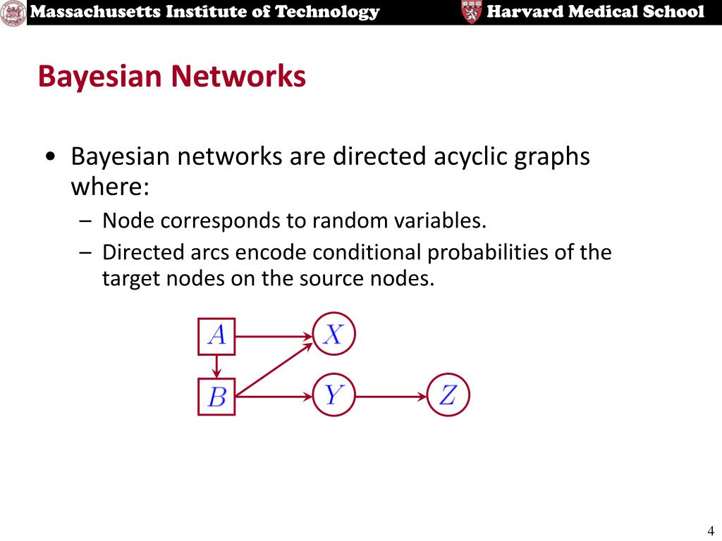 Bayesian Networks • Bayesian networks are directed acyclic graphs where: • Node corresponds to random variables. • Directed arcs encode conditional probabilities of the target nodes on the source nodes.