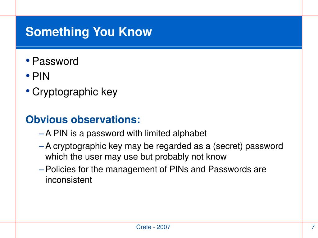 Something You Know • Password • PIN • Cryptographic key Obvious observations: • A PIN is a password with limited alphabet • A cryptographic key may be regarded as a (secret) password which the user may use but probably not know • Policies for the management of PINs and Passwords are inconsistent Crete - 2007