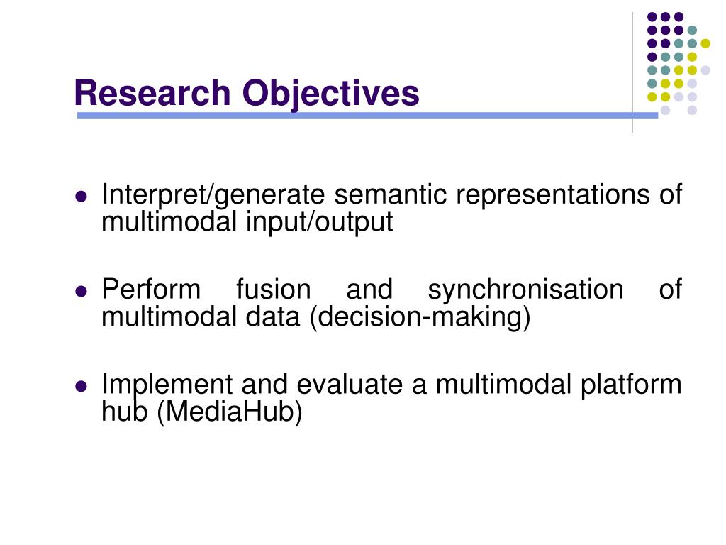 Research Objectives • Interpret/generate semantic representations of multimodal input/output • Perform fusion and synchronisation of multimodal data (decision-making) • Implement and evaluate a multimodal platform hub (MediaHub)