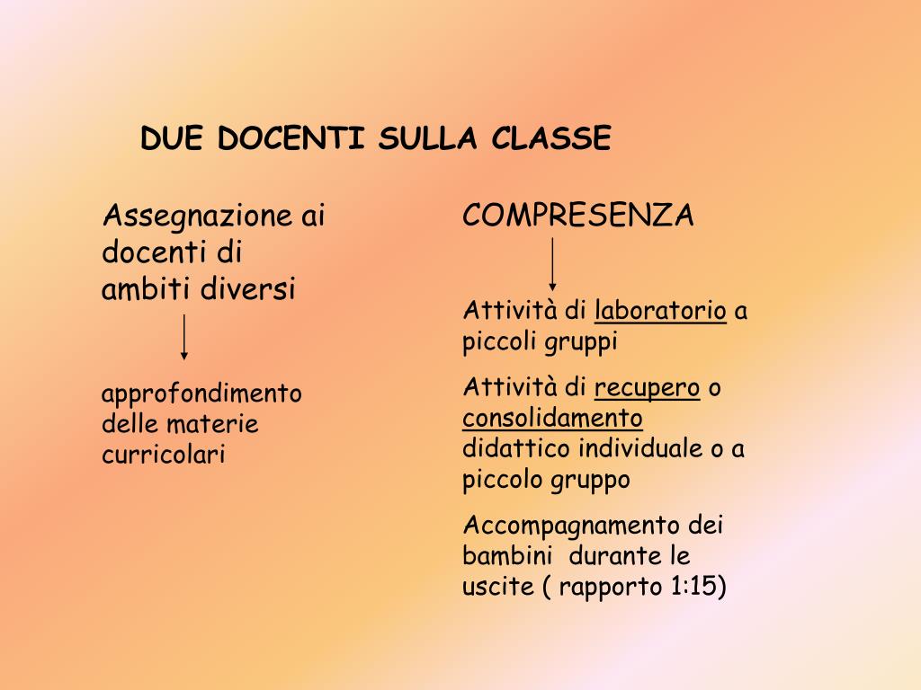 DUE DOCENTI SULLA CLASSE Assegnazione ai docenti di ambiti diversi approfondimento delle materie curricolari COMPRESENZA Attività di laboratorio a piccoli gruppi Attività di recupero o consolidamento didattico individuale o a piccolo gruppo Accompagnamento dei bambini durante le uscite ( rapporto 1:15)