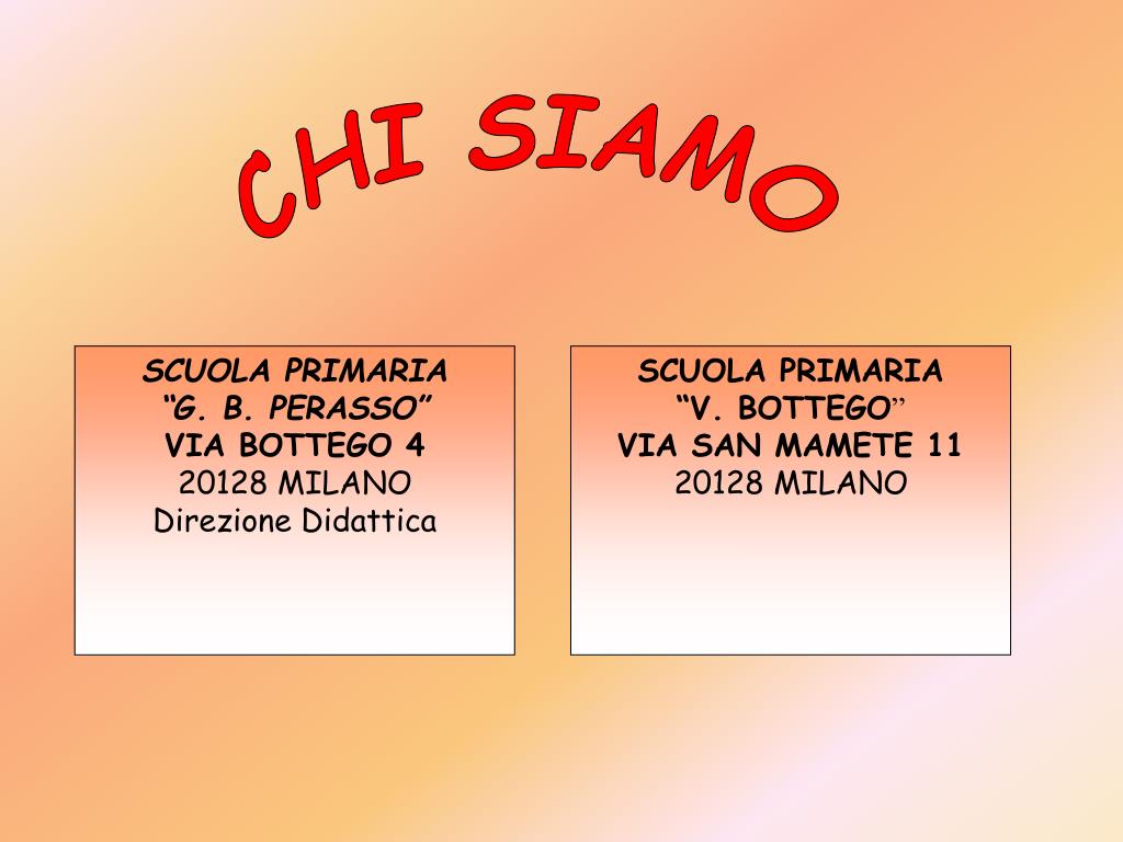 CHI SIAMO SCUOLA PRIMARIA “G. B. PERASSO” VIA BOTTEGO 4 20128 MILANO Direzione Didattica SCUOLA PRIMARIA “V. BOTTEGO” VIA SAN MAMETE 11 20128 MILANO