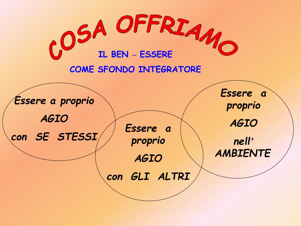 IL BEN – ESSERE COME SFONDO INTEGRATORE COSA OFFRIAMO Essere a proprio AGIO nell’ AMBIENTE Essere a proprio AGIO con SE STESSI Essere a proprio AGIO con GLI ALTRI