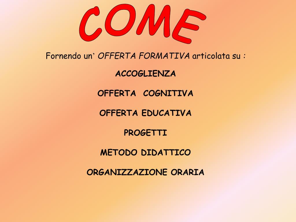 COME Fornendo un’OFFERTA FORMATIVA articolata su : ACCOGLIENZA OFFERTA COGNITIVA OFFERTA EDUCATIVA PROGETTI METODO DIDATTICO ORGANIZZAZIONE ORARIA