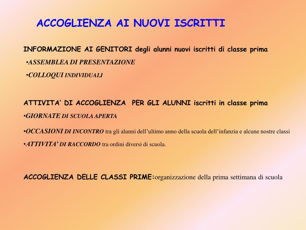 ACCOGLIENZA AI NUOVI ISCRITTI INFORMAZIONE AI GENITORI degli alunni nuovi iscritti di classe prima • ASSEMBLEA DI PRESENTAZIONE • COLLOQUI INDIVIDUALI ATTIVITA’ DI ACCOGLIENZA PER GLI ALUNNI iscritti in classe prima • GIORNATE DI SCUOLA APERTA • OCCASIONI DI INCONTROtra gli alunni dell’ultimo anno della scuola dell’infanzia e alcune nostre classi • ATTIVITA’ DI RACCORDO tra ordini diversi di scuola. ACCOGLIENZA DELLE CLASSI PRIME:organizzazione della prima settimana di scuola