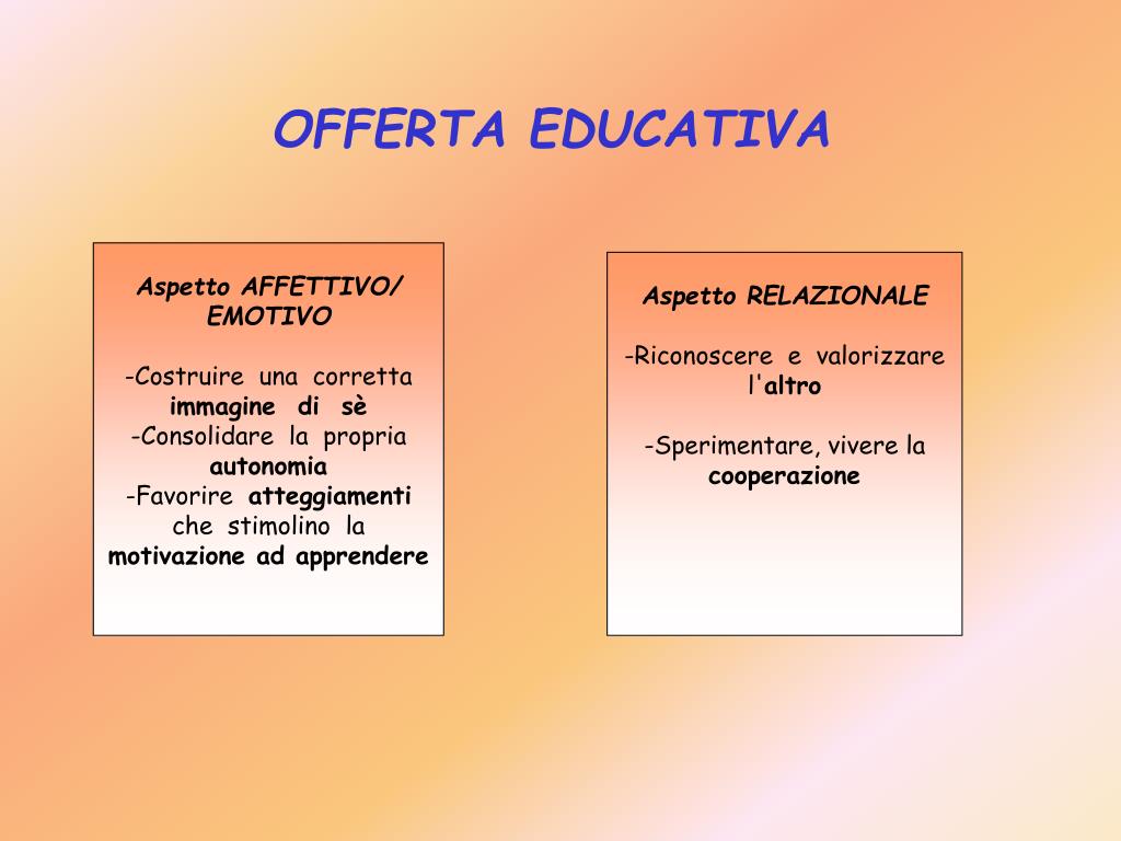 OFFERTA EDUCATIVA Aspetto AFFETTIVO/ EMOTIVO -Costruire una corretta immagine di sè -Consolidare la propria autonomia -Favorire atteggiamenti che stimolino la motivazione ad apprendere Aspetto RELAZIONALE -Riconoscere e valorizzare l'altro -Sperimentare, vivere la cooperazione