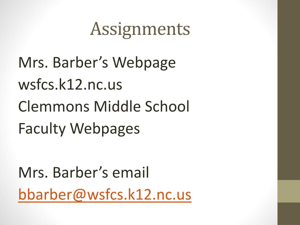 Assignments Mrs. Barber’s Webpage wsfcs.k12.nc.us Clemmons Middle School Faculty Webpages Mrs. Barber’s email bbarber@wsfcs.k12.nc.us