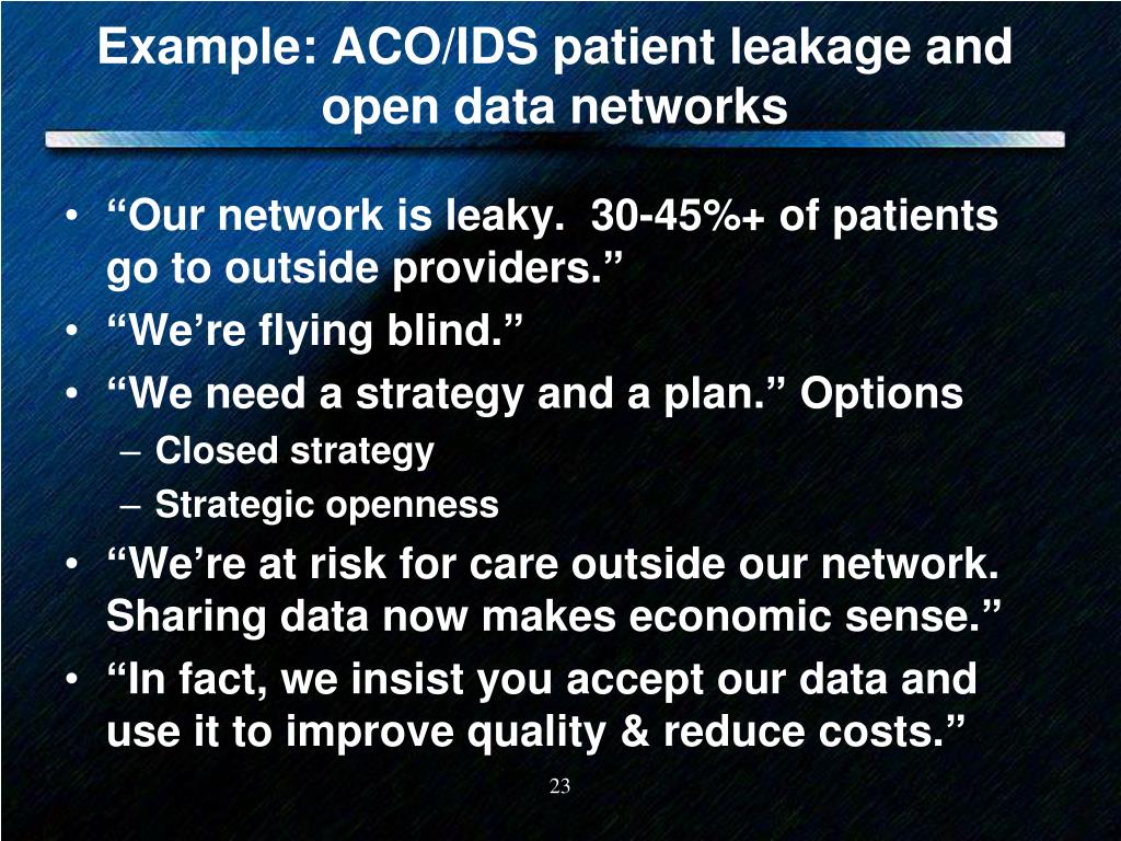 Example: ACO/IDS patient leakage and open data networks • “Our network is leaky. 30-45%+ of patients go to outside providers.” • “We’re flying blind.” • “We need a strategy and a plan.” Options • Closed strategy • Strategic openness • “We’re at risk for care outside our network. Sharing data now makes economic sense.” • “In fact, we insist you accept our data and use it to improve quality & reduce costs.”