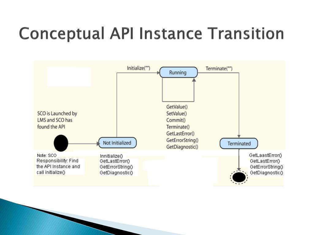 Run time environmentCommunicating with the LMS /* look up window hierarchy to find LMS provided API */ API.Initialize(“”); var name = API.GetValue(“cmi.learner_name”); API.SetValue(“cmi.score.scaled”, “0.9”); API.Terminate(“”);