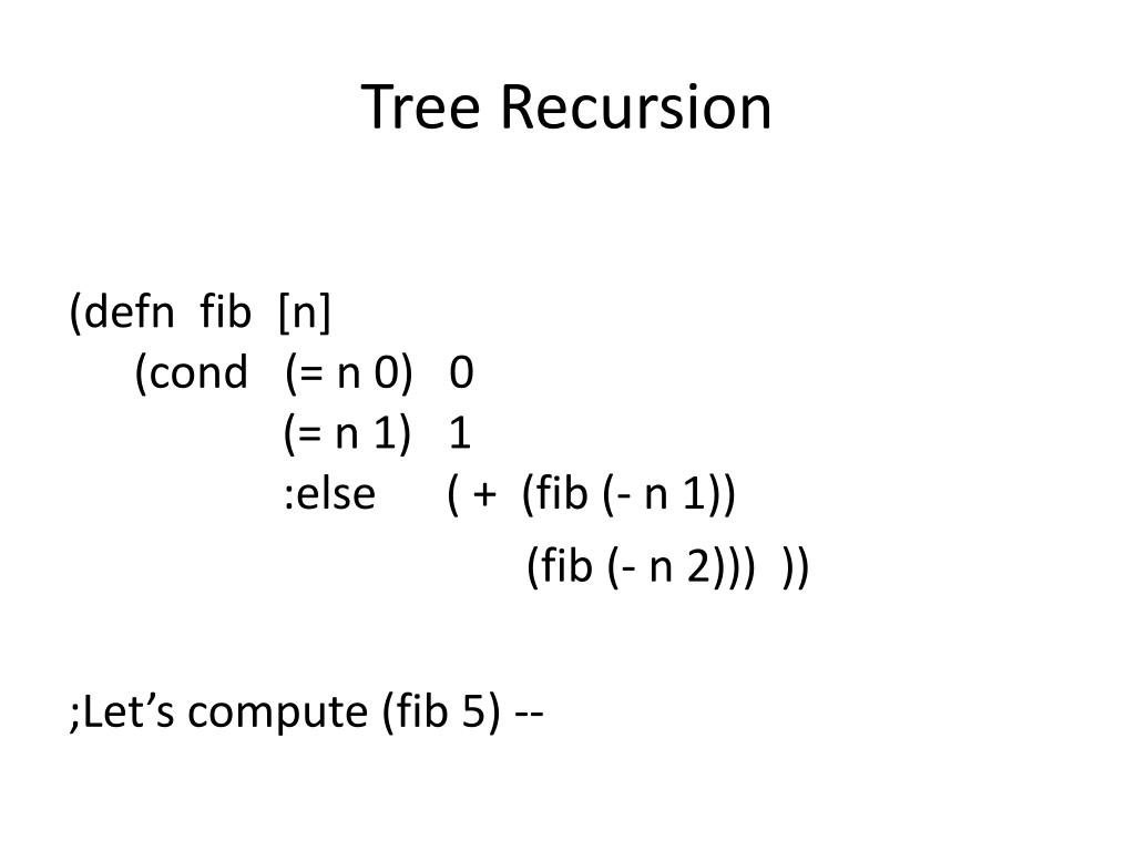 Tree Recursion (defn fib [n] (cond (= n 0) 0 (= n 1) 1 :else ( + (fib (- n 1)) (fib (- n 2))) )) ;Let’s compute (fib 5) --