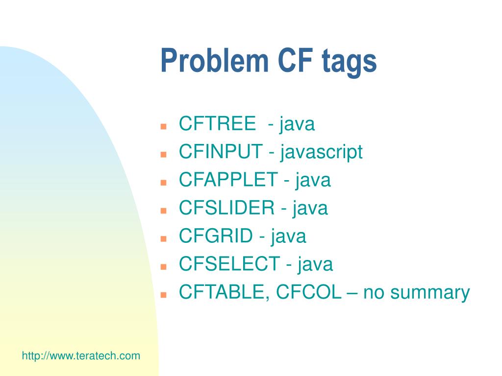 Problem CF tags • CFTREE - java • CFINPUT - javascript • CFAPPLET - java • CFSLIDER - java • CFGRID - java • CFSELECT - java • CFTABLE, CFCOL – no summary