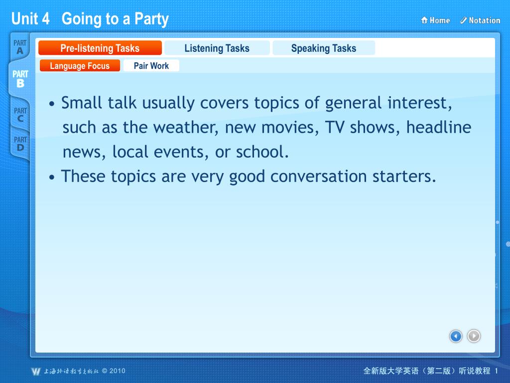 PartB_1 Pre-listening Tasks Listening Tasks Speaking Tasks Language Focus Pair Work • Small talk usually covers topics of general interest, • such as the weather, new movies, TV shows, headline • news, local events, or school. • These topics are very good conversation starters.