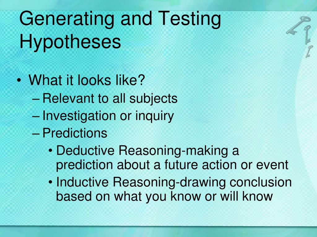Generating and Testing Hypotheses • What it looks like? • Relevant to all subjects • Investigation or inquiry • Predictions • Deductive Reasoning-making a prediction about a future action or event • Inductive Reasoning-drawing conclusion based on what you know or will know
