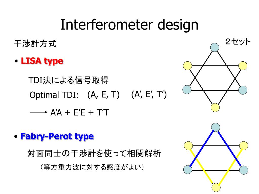 Interferometer design 2セット 干渉計方式 • LISA type TDI法による信号取得 (A’, E’, T’) (A, E, T) Optimal TDI: A’A + E’E + T’T • Fabry-Perot type 対面同士の干渉計を使って相関解析 (等方重力波に対する感度がよい)