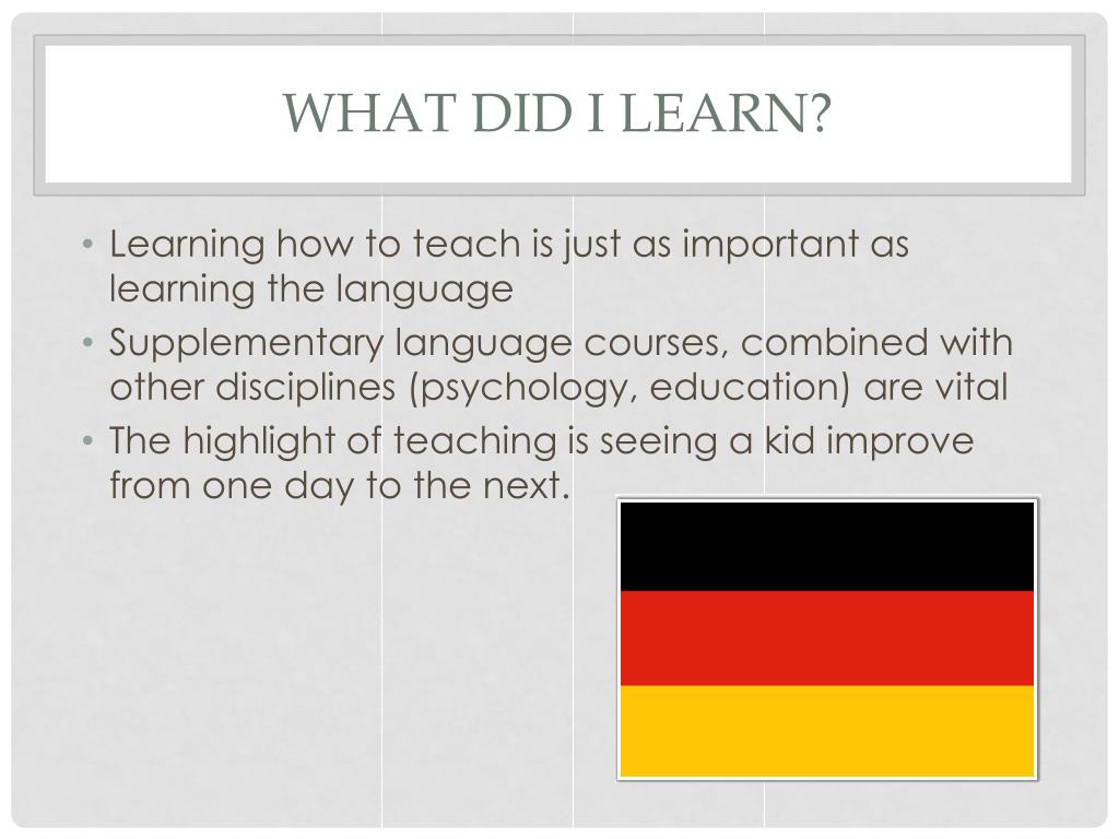 What did I learn? • Learning how to teach is just as important as learning the language • Supplementary language courses, combined with other disciplines (psychology, education) are vital • The highlight of teaching is seeing a kid improve from one day to the next.