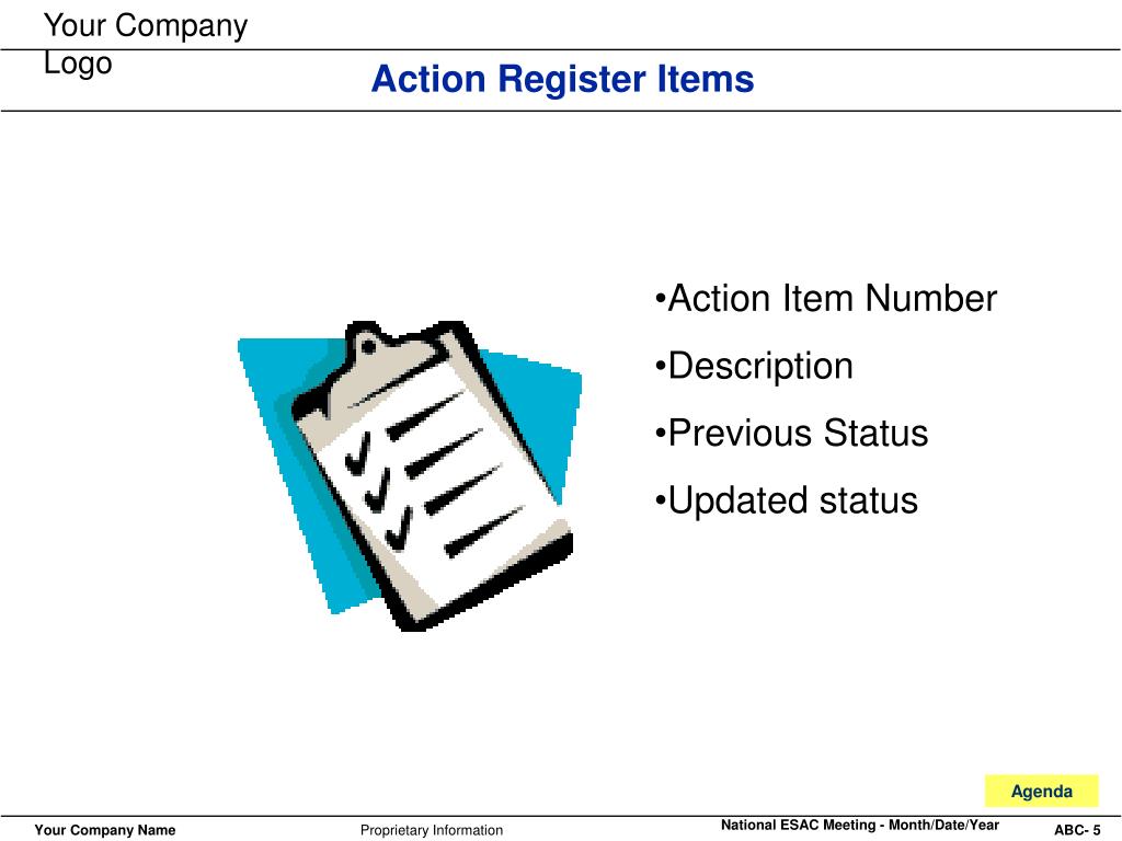 Action Register Items • Action Item Number • Description • Previous Status • Updated status Agenda