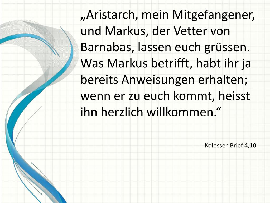„Aristarch, mein Mitgefangener, und Markus, der Vetter von Barnabas, lassen euch grüssen. Was Markus betrifft, habt ihr ja bereits Anweisungen erhalten; wenn er zu euch kommt, heisst ihn herzlich willkommen.“ Kolosser-Brief 4,10