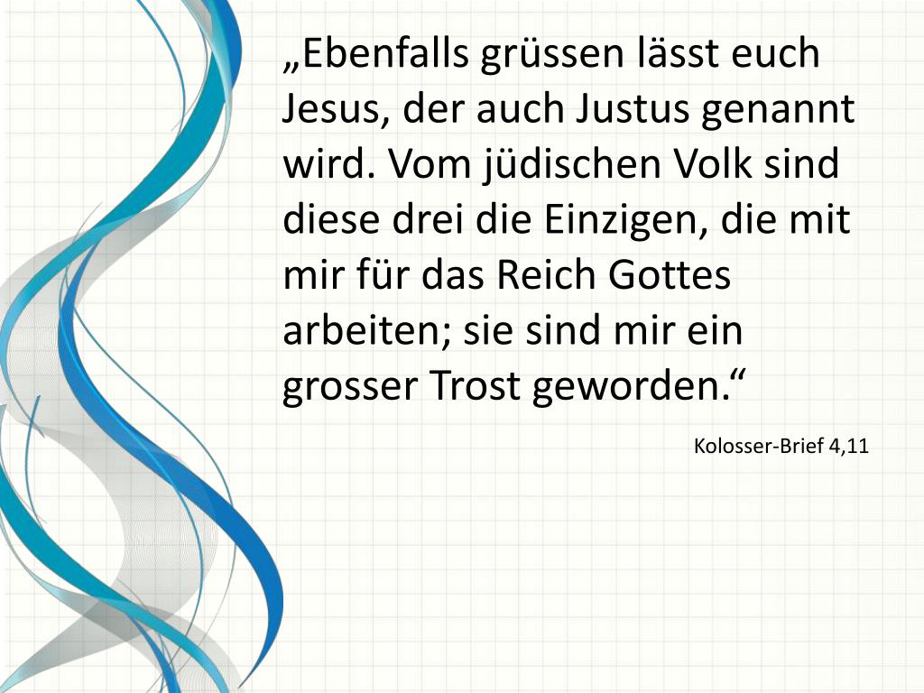„Ebenfalls grüssen lässt euch Jesus, der auch Justus genannt wird. Vom jüdischen Volk sind diese drei die Einzigen, die mit mir für das Reich Gottes arbeiten; sie sind mir ein grosser Trost geworden.“ Kolosser-Brief 4,11