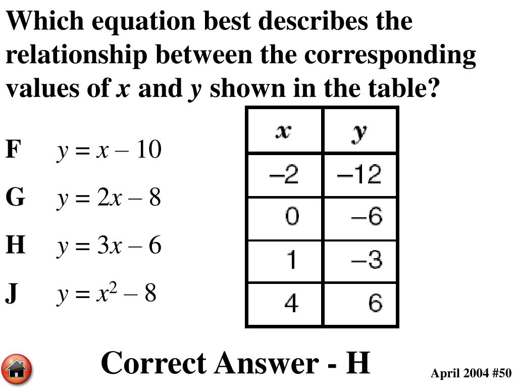 Which equation best describes the relationship between the corresponding values of x and y shown in the table? Fy = x – 10 Gy = 2x – 8 Hy = 3x – 6 Jy = x2 – 8 Correct Answer - H April 2004 #50