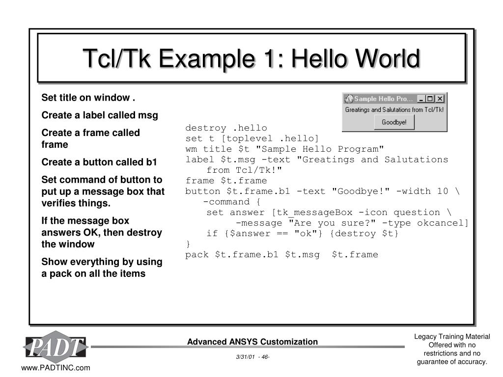 NOTE: • This documents contains the notes from a section of a class that PADT wrote in 2001. • It has not been reviewed or updated since around 2003 • Tcl/Tk in ANSYS has become a legacy feature that is no longer being enhanced or added to and its usage has been and should be declining. • PADT presents it here with no restrictions to the ANSYS user community • Enjoy Advanced ANSYS Customization 3/31/01 - 1-