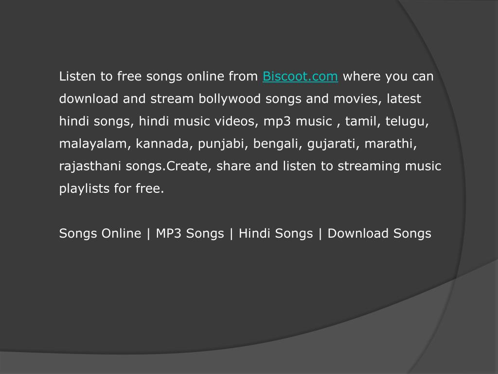 Listen to free songs online from Biscoot.com where you can download and stream bollywood songs and movies, latest hindi songs, hindi music videos, mp3 music , tamil, telugu, malayalam, kannada, punjabi, bengali, gujarati, marathi, rajasthani songs.Create, share and listen to streaming music playlists for free.Songs Online | MP3 Songs | Hindi Songs | Download Songs
