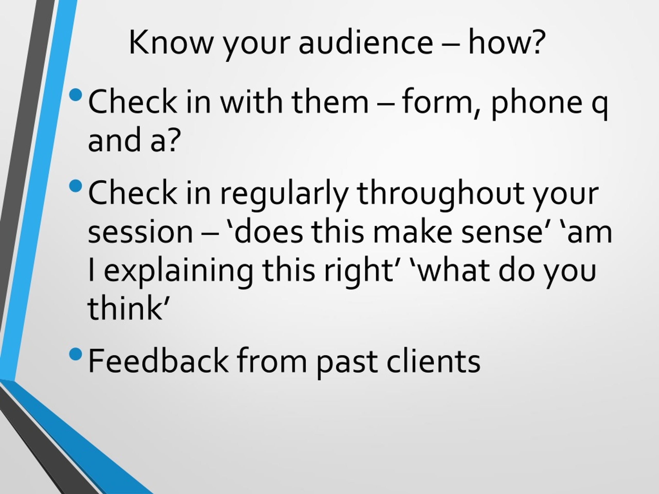 Know your audience – how? • Check in with them – form, phone q and a? • Check in regularly throughout your session – ‘does this make sense’ ‘am I explaining this right’ ‘what do you think’ • Feedback from past clients