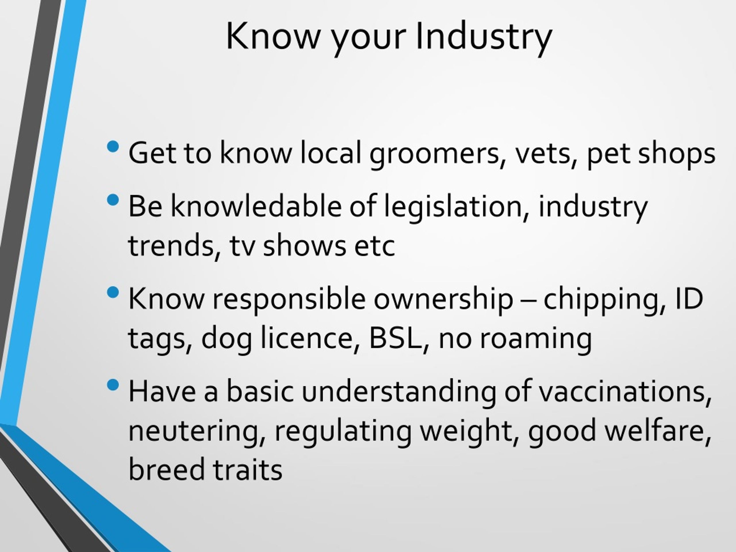Know your Industry • Get to know local groomers, vets, pet shops • Be knowledable of legislation, industry trends, tv shows etc • Know responsible ownership – chipping, ID tags, dog licence, BSL, no roaming • Have a basic understanding of vaccinations, neutering, regulating weight, good welfare, breed traits