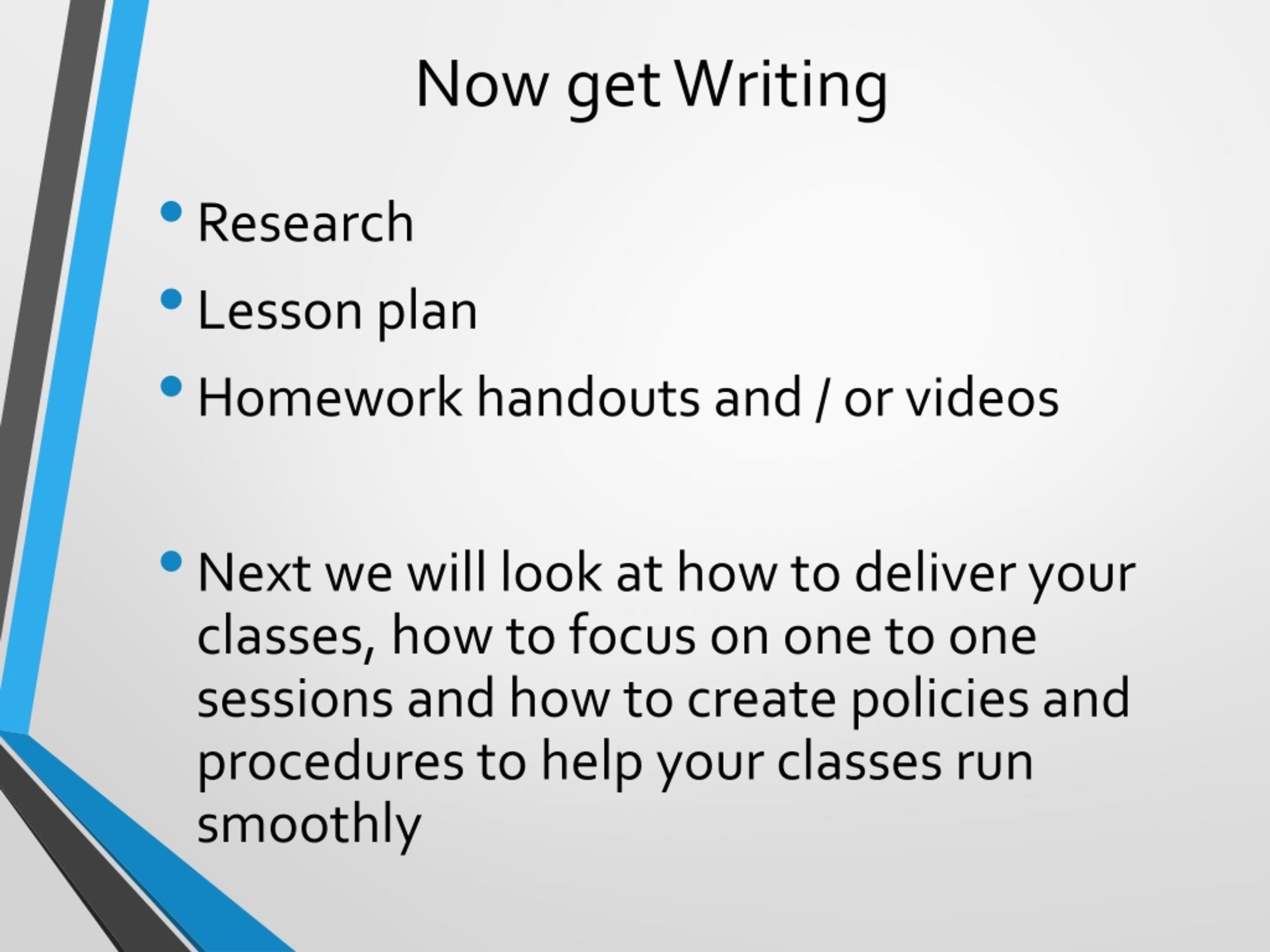 Now get Writing • Research • Lesson plan • Homework handouts and / or videos • Next we will look at how to deliver your classes, how to focus on one to one sessions and how to create policies and procedures to help your classes run smoothly