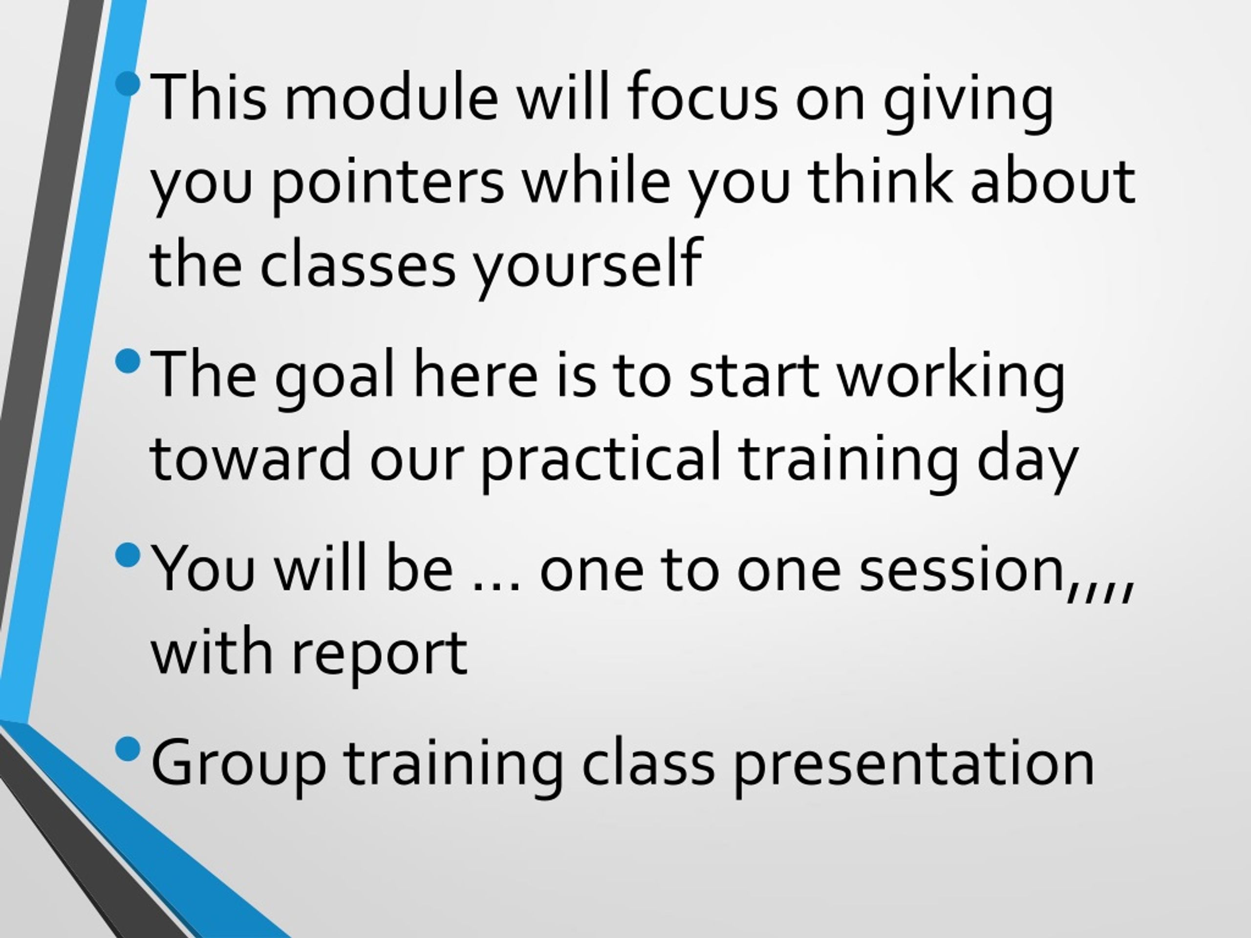 This module will focus on giving you pointers while you think about the classes yourself • The goal here is to start working toward our practical training day • You will be … one to one session,,,, with report • Group training class presentation