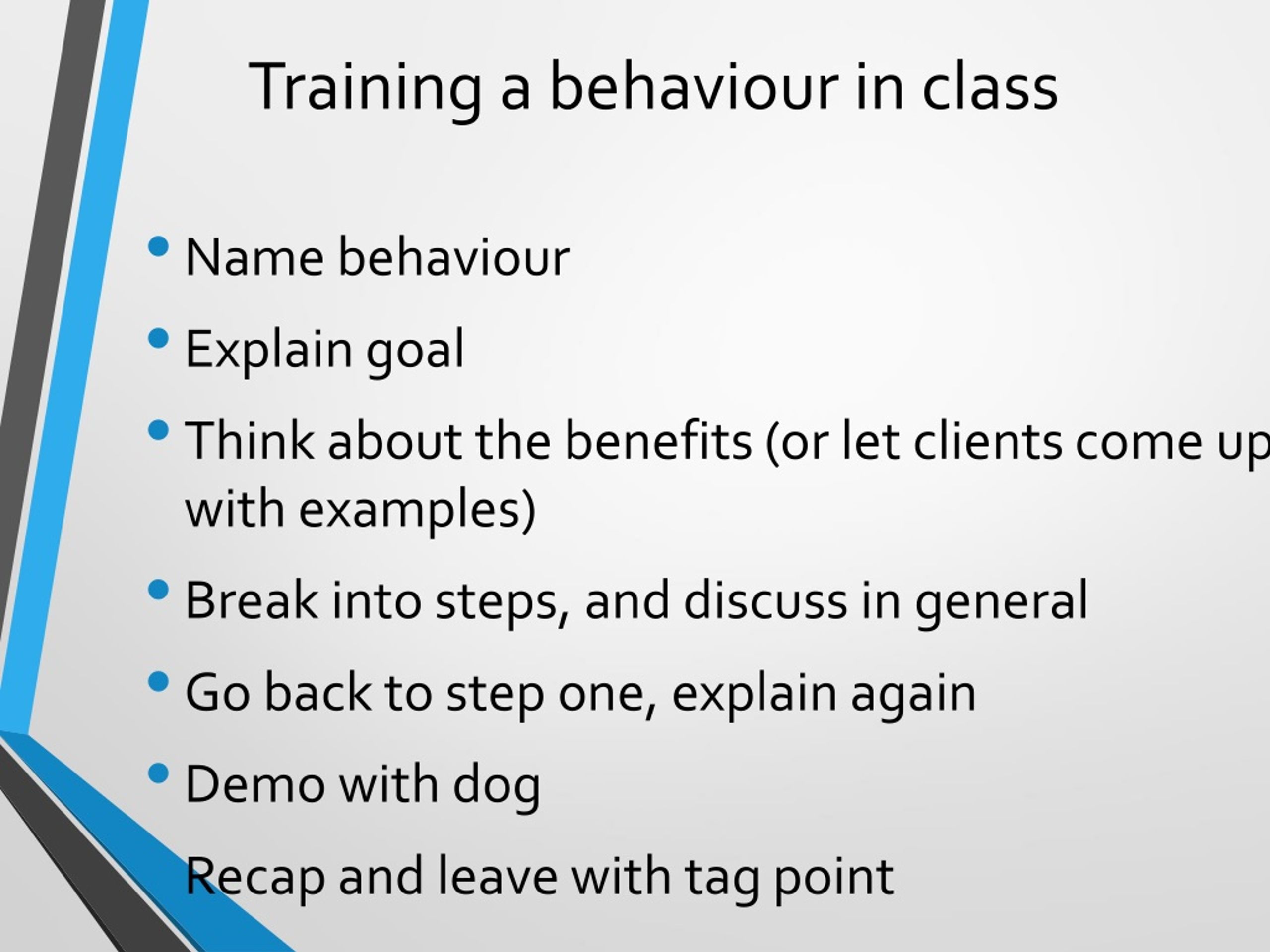 Training a behaviour in class • Name behaviour • Explain goal • Think about the benefits (or let clients come up with examples) • Break into steps, and discuss in general • Go back to step one, explain again • Demo with dog • Recap and leave with tag point