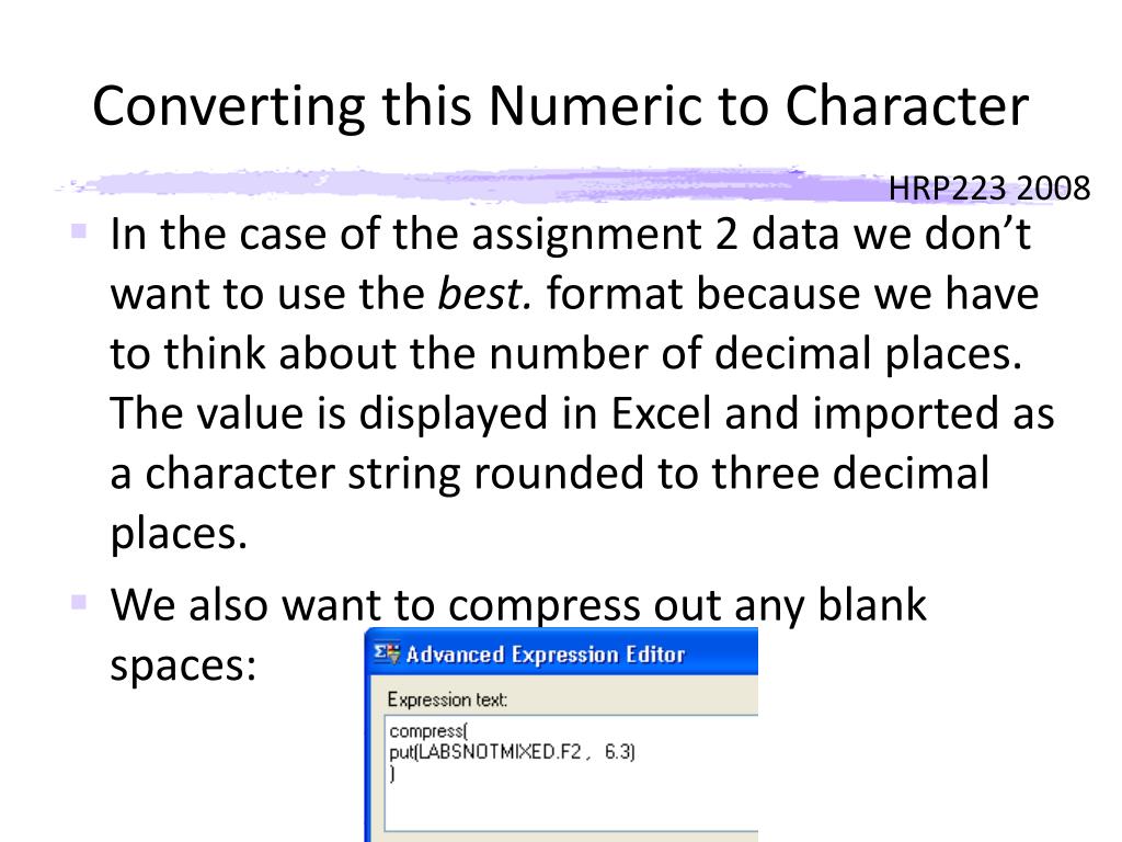 Converting this Numeric to Character In the case of the assignment 2 data we don’t want to use the best. format because we have to think about the number of decimal places. The value is displayed in Excel and imported as a character string rounded to three decimal places. We also want to compress out any blank spaces: