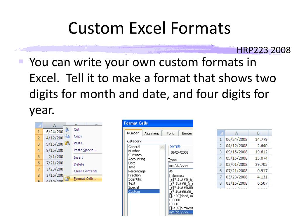Custom Excel Formats You can write your own custom formats in Excel. Tell it to make a format that shows two digits for month and date, and four digits for year.